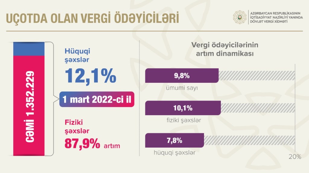 2022-ci ilin martın 1-nə respublika üzrə uçotda olan 1.352.229 vergi ödəyicisinin 87,9%-i fiziki şəxslər, 12,1%-i hüquqi şəxslər və digər təşkilatlar olub.
