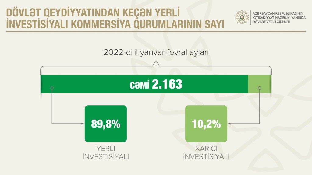 Yanvar-fevral ayları ərzində 2.163 kommersiya qurumu dövlət qeydiyyatından keçib ki, bu da ötən ilin müvafiq dövrü ilə müqayisədə 13,2% çoxdur. Həmin kommersiya qurumlarının 84,9%-i elektron qaydada, 15,1%-i kağız daşıyıcılarında edilmiş müraciətlər əsasında qeydiyyata alınıb. 2.163 kommersiya qurumundan 89,8%-i yerli investisiyalı, 10,2%-i xarici investisiyalı müəssisələrdir. 364 kommersiya qurumunun ƏDV məqsədləri üçün qeydiyyata alınması təmin olunub.