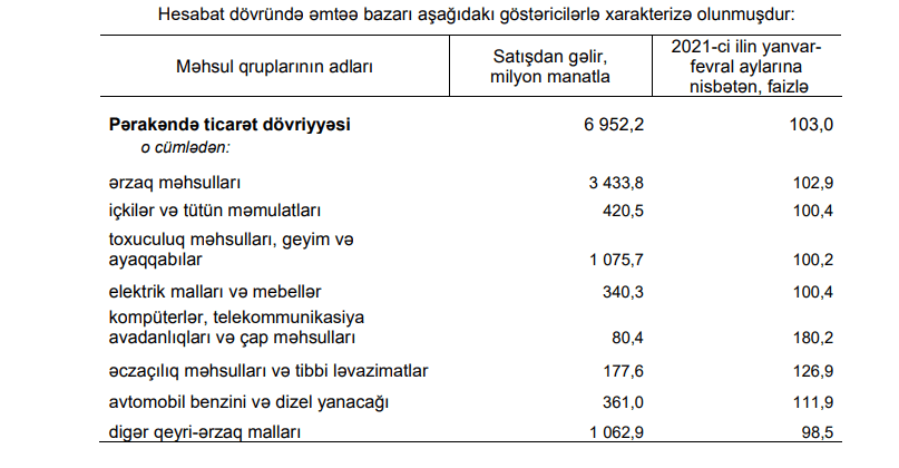 TIME rəsmi mənbəyə istinadən bildirir ki, 2021-ci ilin yanvar-fevral ayları ilə müqayisədə pərakəndə ticarət dövriyyəsi real ifadədə 3,0 faiz, o cümlədən ərzaq məhsulları, içkilər və tütün məmulatları üzrə 2,6 faiz, qeyri-ərzaq malları üzrə 3,5 faiz artıb.