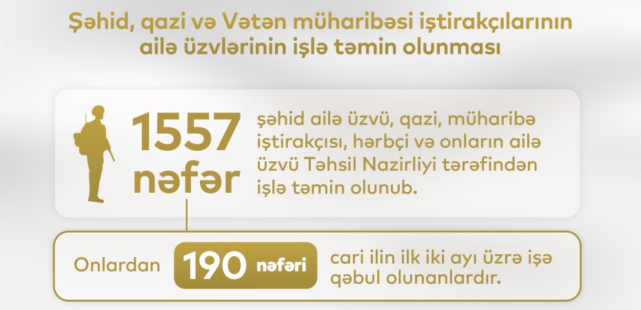 1557 nəfər şəhid ailə üzvü, qazi, müharibə iştirakçısı, hərbçi və onların ailə üzvü Təhsil Nazirliyi tərəfindən işlə təmin olunub.