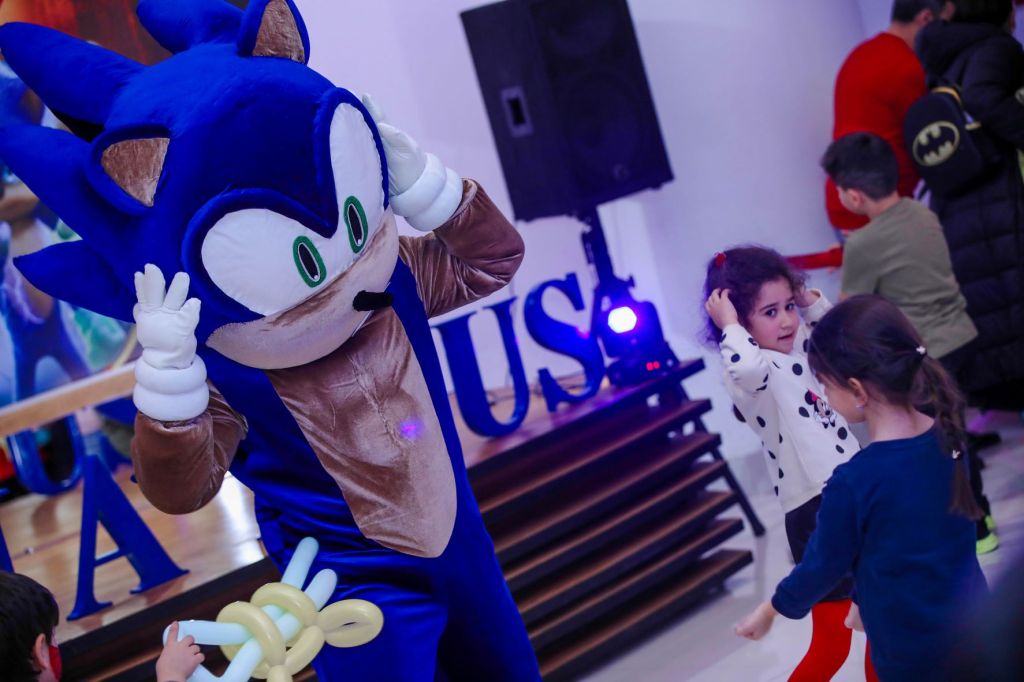 Tamaşanın mərkəzində hər tərəfdən uşaqlarla əhatə olunmuş böyük Sonik personajı var idi. Onlar onunla rəqs edib, şəkil çəkdirirdilər. Nail Nəzərovun komandası balaca qonaqlara şarlardan fiqurlar hədiyyə edib, rəssam isə onların üzlərinə müxtəlif şəkillər çəkib.