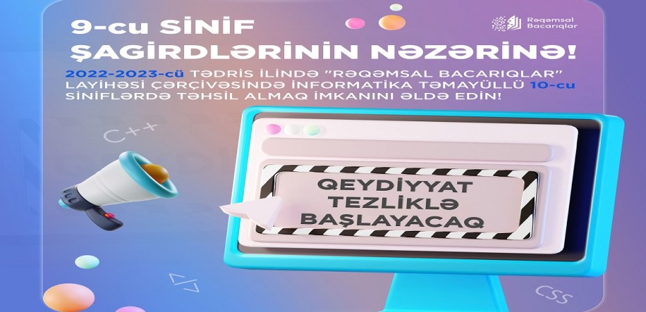 2022-2023-cü tədris ilində “Rəqəmsal bacarıqlar” layihəsi çərçivəsində yeni informatika təmayüllü X siniflərin açılması nəzərdə tutulur.