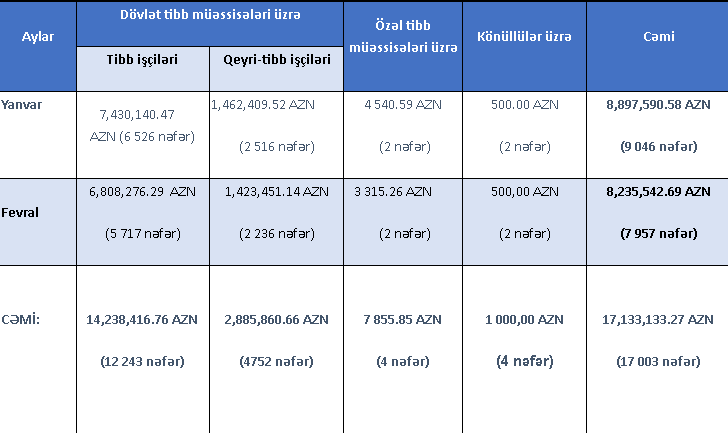 Tibb və qeyri-tibb tibb işçilərinə, eləcə də könüllülərə qeyd edilən aylar üzrə ödənilən müddətli əlavə və mükafatların məbləği aşağıdakı kimidir: