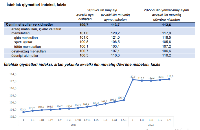 2022-ci ilin yanvar-may aylarında istehlak qiymətləri indeksi 2021-ci ilin yanvar-may aylarına nisbətən 112,6 faiz, o cümlədən ərzaq məhsulları, içkilər və tütün məmulatları üzrə 117,9 faiz, qeyri-ərzaq məhsulları üzrə 106,6 faiz, əhaliyə göstərilmiş ödənişli xidmətlər üzrə 110,2 faiz təşkil edib.