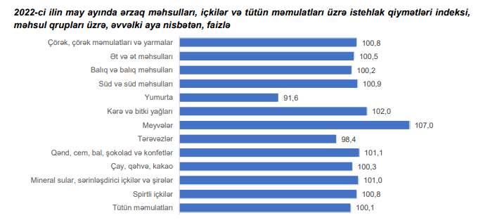 2022-ci ilin may ayında ərzaq məhsulları, içkilər və tütün məmulatları üzrə istehlak qiymətləri indeksi əvvəlki aya nisbətən 101,0 faiz, əvvəlki ilin may ayına nisbətən 120,2 faiz təşkil edib.