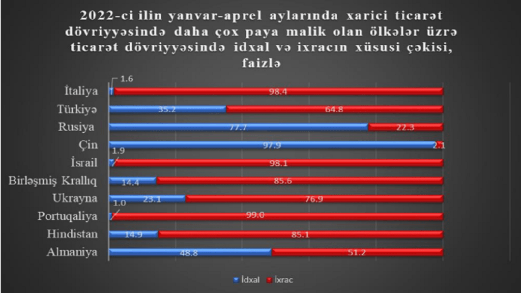 2022-ci ilin yanvar-aprel aylarında Azərbaycan Respublikasının hüquqi və fiziki şəxsləri dünyanın 155 ölkəsindəki tərəfdaşları ilə ticarət əməliyyatları həyata keçirmiş, 104 ölkəyə məhsul ixrac olunmuş, 144 ölkədən idxal olunub.