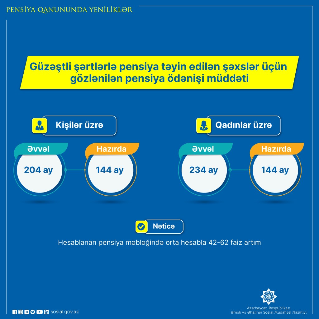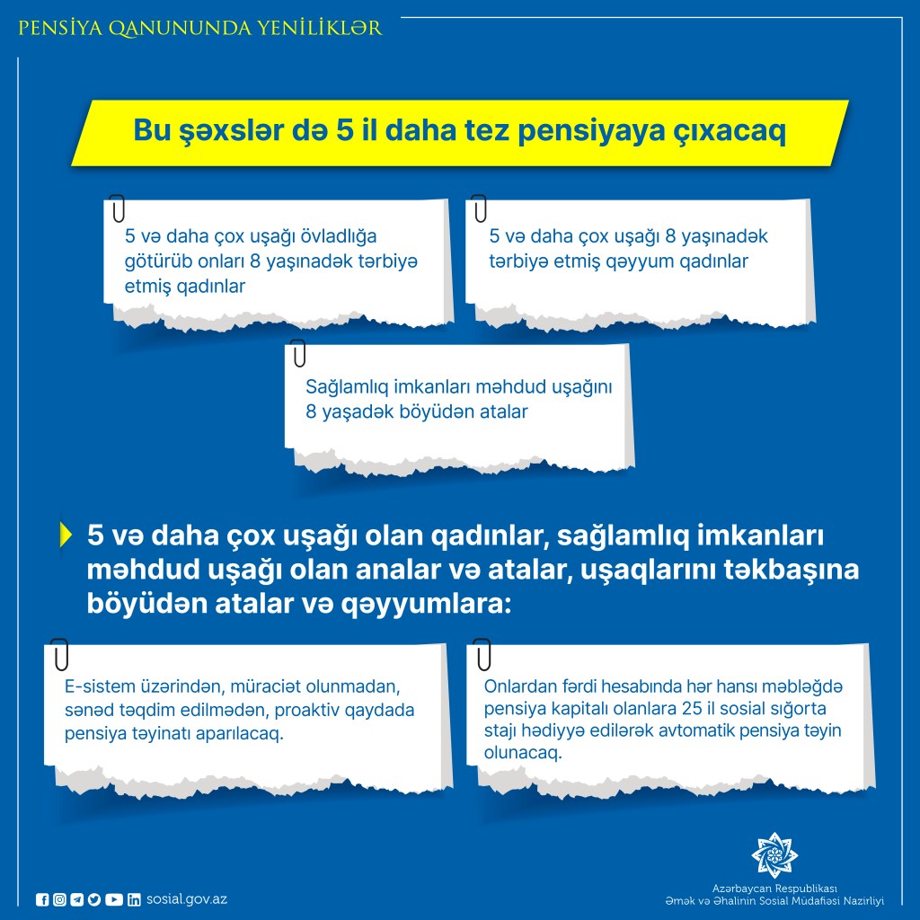 - Bu dəyişiklik hər il orta hesabla əlavə 960 nəfərin pensiya hüququnun yaranmasına da imkan verəcək. Yeni dəyişikliklə həmçinin: