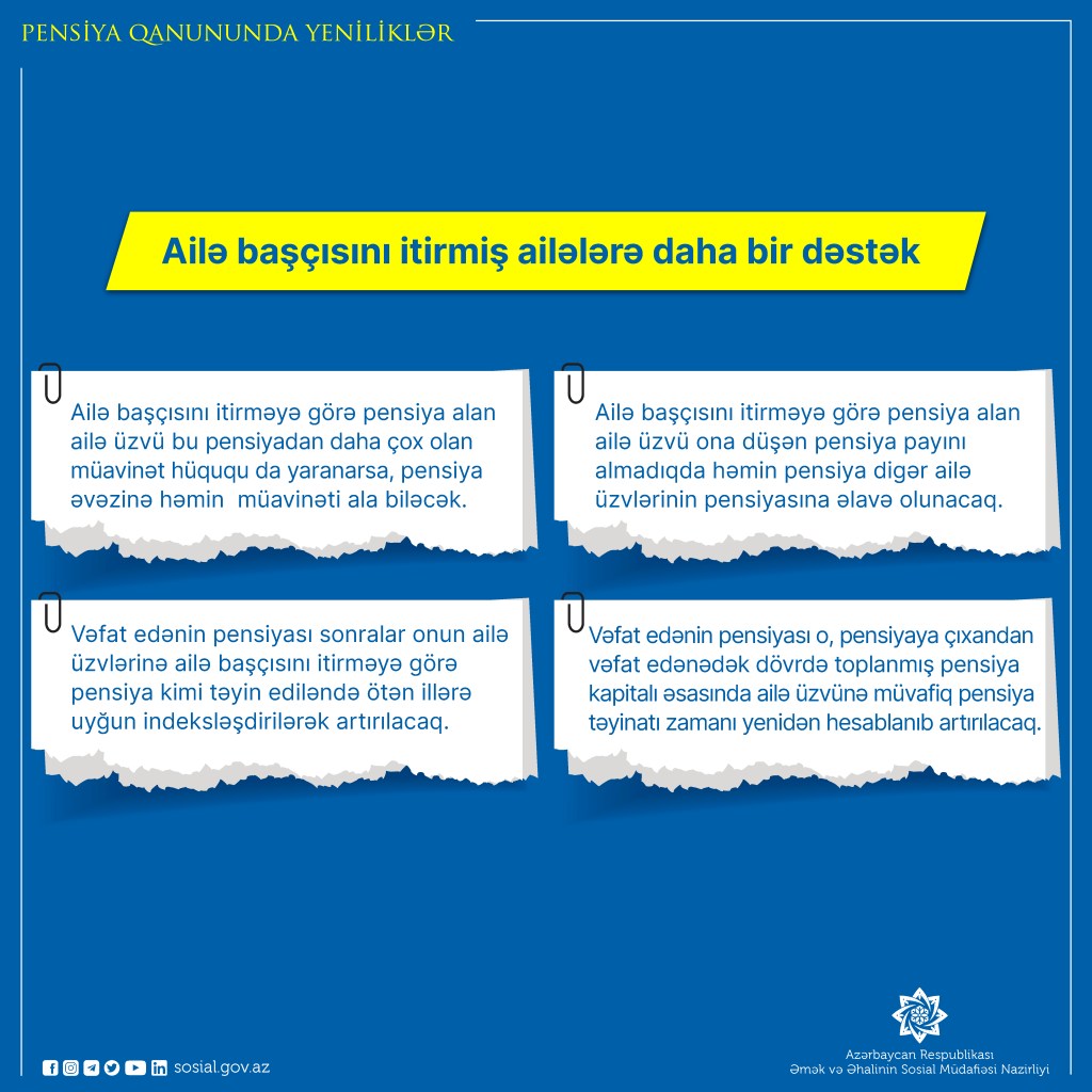 - Vəfat etmiş pensiyaçının pensiyasının məbləğinin də o, pensiyaya çıxdıqdan sonra vəfat edənədək topladığı pensiya kapitalı nəzərə alınmaqla ailə üzvünə müvafiq pensiya təyinatı zamanı yenidən hesablanması imkanı yaradılır.