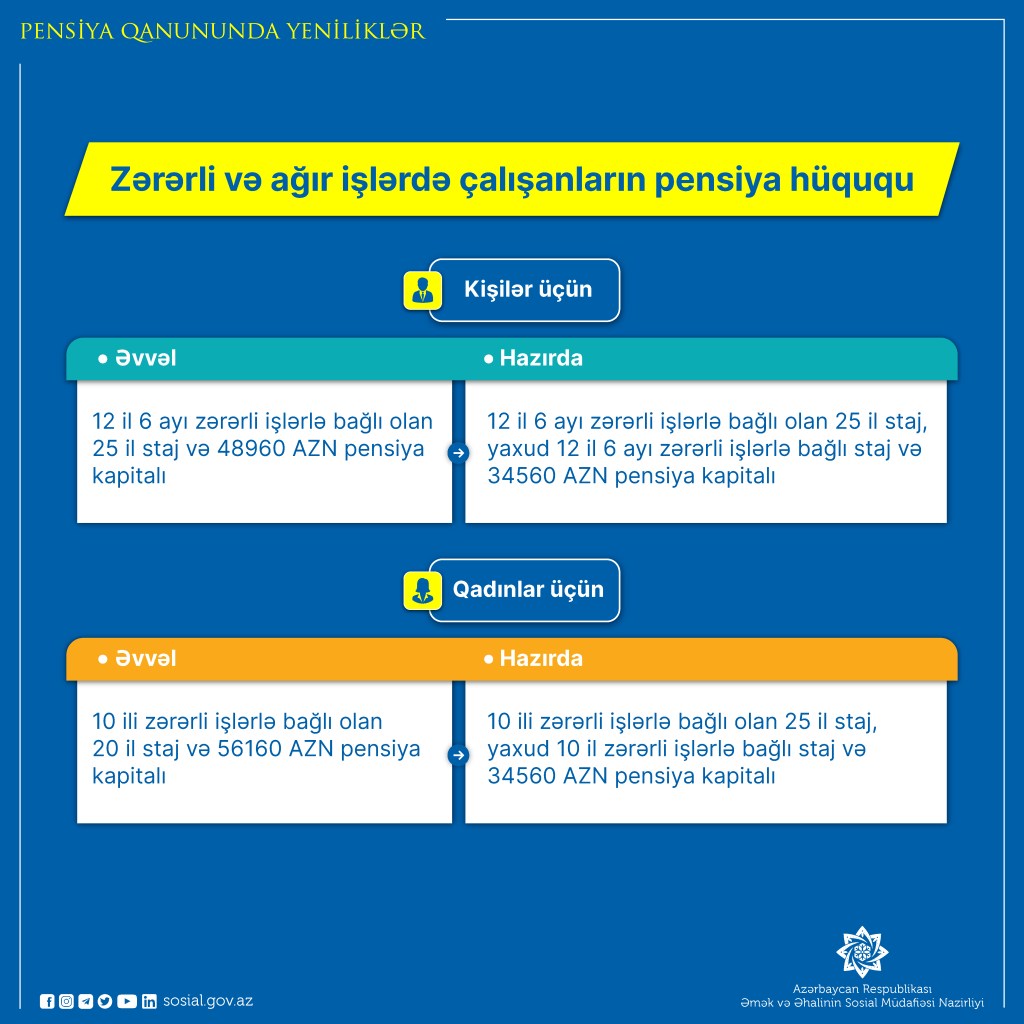 - bundan sonra – 10 ili zərərli işlərlə bağlı olan 25 il staj, yaxud 10 il zərərli işlərlə bağlı staj və fərdi hesabda 34560 manat pensiya kapitalı tələb olunacaq.