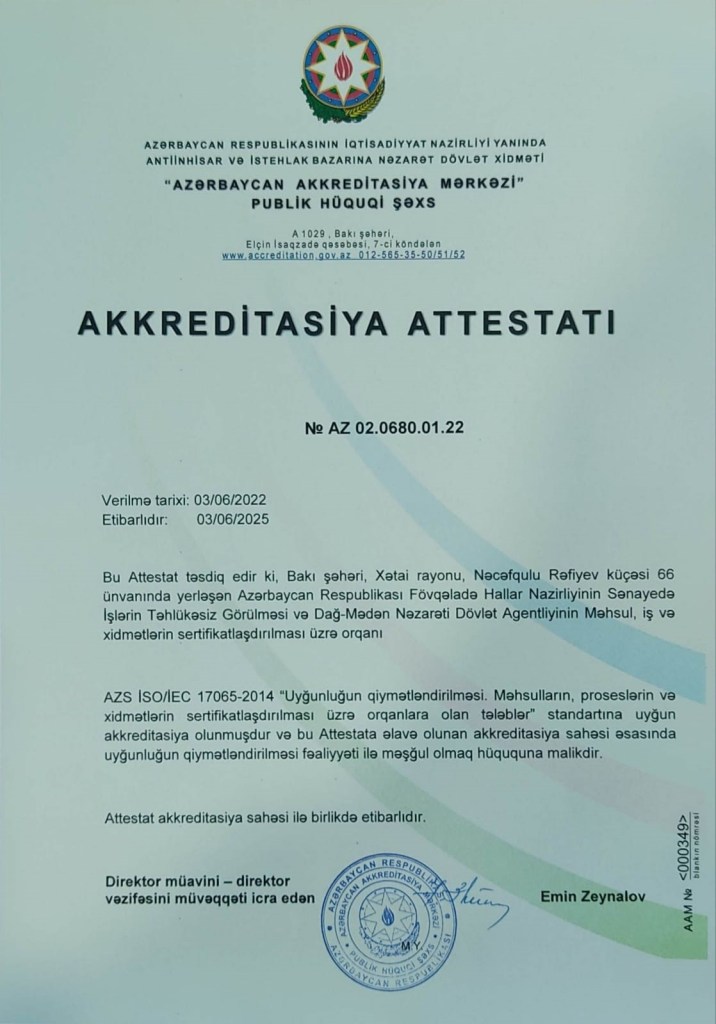 Fövqəladə Hallar Nazirliyi Sənayedə İşlərin Təhlükəsiz Görülməsi və Dağ-mədən Nəzarəti Dövlət Agentliyi AZS İSO/İES 17065-2014 “Uyğunluğun qiymətləndirilməsi. Məhsulların, proseslerin və xidmətlərin sertifikatlaşdırılması üzrə orqanlara olan tələblər” standartına uyğun akkreditasiya olunub.