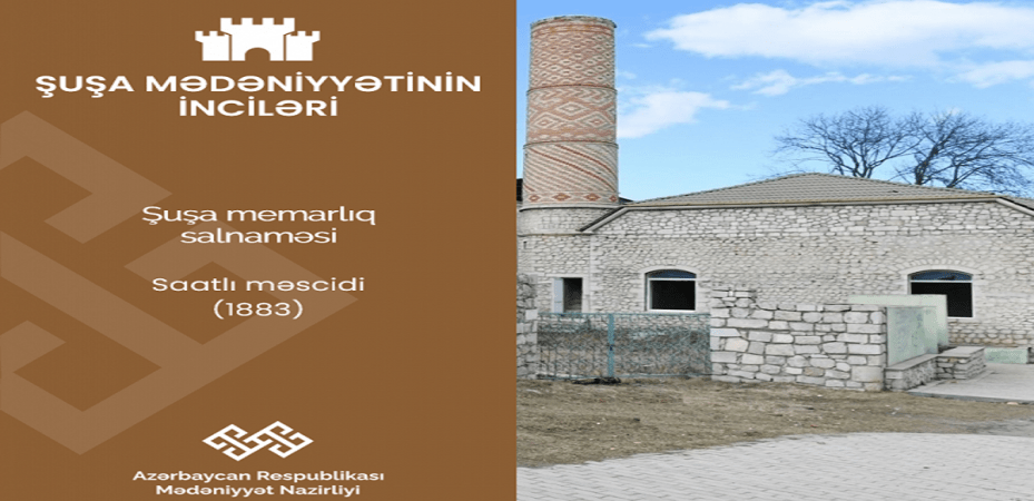 Mədəniyyət Nazirliyi tərəfindən “Şuşa İli” münasibətilə həyata keçirilən “Şuşa mədəniyyətinin inciləri” layihəsi yeni təqdimatlarla davam edir. Layihənin “Şuşanın memarlıq salnaməsi” bölməsi üzrə növbəti təqdimat qala-şəhərimizin Saatlı məscidinə həsr olunub.