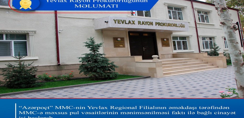 “Azərpoçt” MMC-nin Yevlax Regional Filialının əməkdaşı tərəfindən MMC-ə məxsus pul vəsaitlərinin mənimsənilməsi faktı ilə bağlı cinayət işi başlanıb.