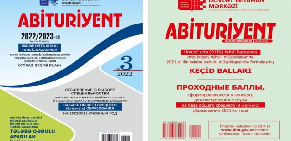 Dövlət İmtahan Mərkəzi “Abituriyent” jurnalının 3-cü nömrəsini və “Ümumi (9 illik) orta təhsil bazasında orta ixtisas təhsili müəssisələrinə 2021-ci ilin tələbə qəbulu müsabiqəsində formalaşmış keçid balları”nı nəşr edib.