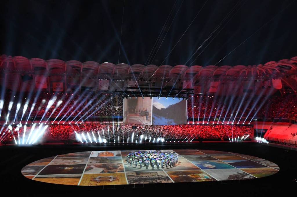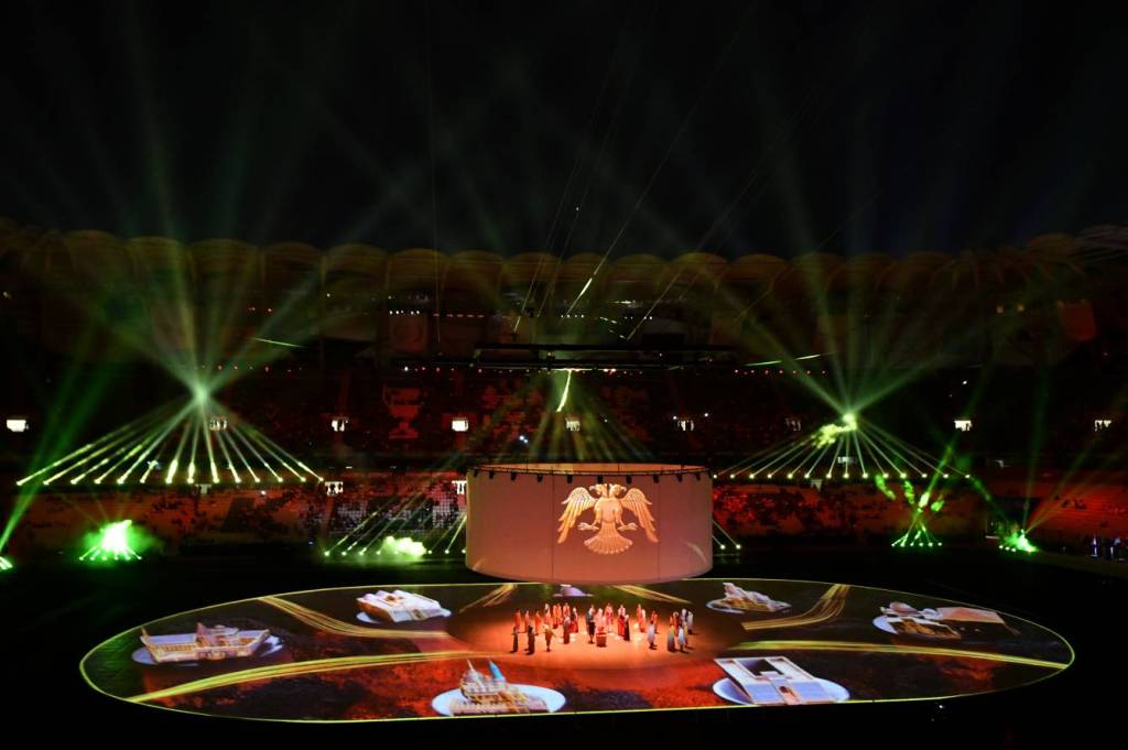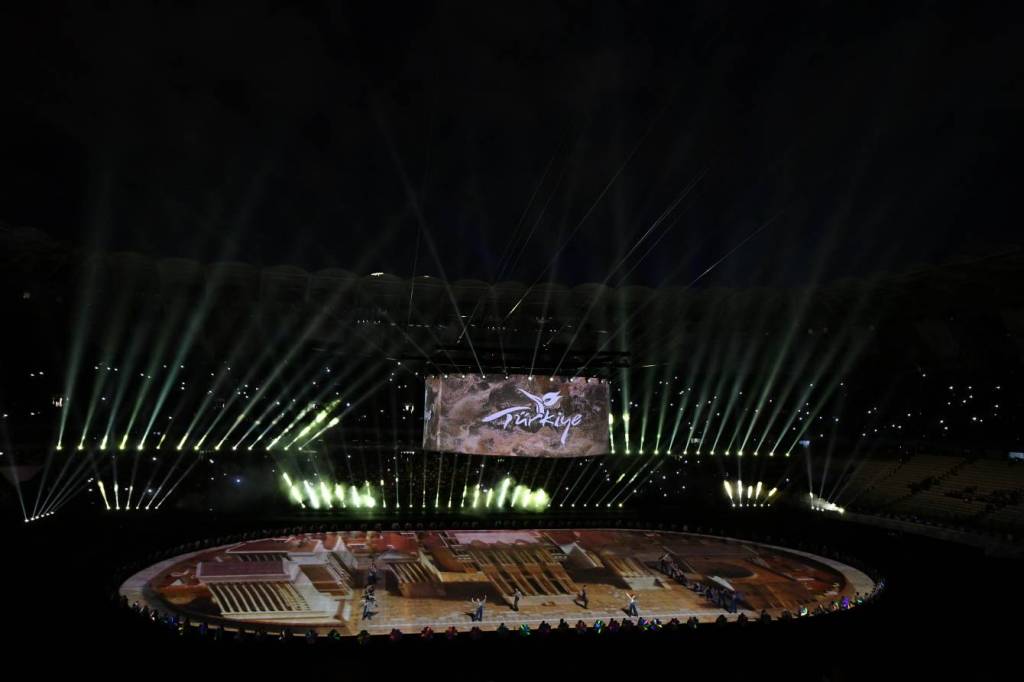 Açılış mərasimində Türkiyə tarixinin müxtəlif dövrlərini və mədəni zənginliklərini əks etdirən kompozisiya nümayiş olundu. Kompozisiyanın sonunda işıq effektləri vasitəsilə səhnədə Türkiyə bayrağı və ay-ulduz fiquru təcəssüm etdirildi. Ardınca hərbçilər Türkiyənin Dövlət Bayrağını səhnəyə gətirdilər. Bayraq Türkiyənin Dövlət Himni – “İstiqlal Marşı”nın sədaları altında qaldırıldı.