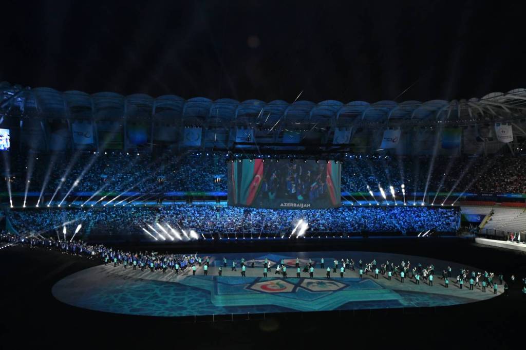 Açılış mərasimində Azərbaycanın üçrəngli bayrağını atlet Nazim Babayev və voleybolçu Ayşən Abduləzimova apardılar.