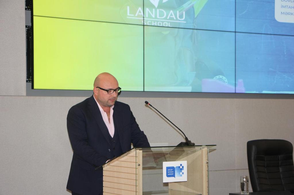 Tədbirdə çıxış edən “LANDAU School” Tədris Kompleksinin təsisçisi və Müşahidə Şurasının üzvü Emil Leznik öncə qonaqları salamlayıb. Daha sonra DİM ilə birgə əməkdaşlıq çərçivəsində tərtib edilən elmi-metodiki vəsaitlər barədə məlumat verən Emil Leznik kitabların həm qəbul, həm də 9-cu və 11-ci sinif buraxılış imtahanlarına hazırlaşmaq üçün nəzərdə tutulduğunu və bu dərs vəsaitlərinin əsas məqsədinin abituriyentlərin ali təhsil müəssisələrinə qəbuluna repetitorsuz, müstəqil hazırlaşa bilmələri üçün olduğunu bildirib. Emil Leznik “LANDAU School” Tədris Kompleksi haqqında da iştirakçılara məlumat verib. Çıxışında “LANDAU School”un həm Azərbaycan Respublikası, həm də bütün Qafqaz ərazisində ən böyük özəl məktəb kimi tanınan tam orta təhsil müəssisəsi olduğunu, tədrisin Azərbaycan, rus və ingilis dillərində həyata keçirilməsini, Kompleksin digər məktəblərdən fərqləndirən əsas cəhətinin tədris prosesinin özünəməxsus prinsiplərinin olduğunu və bu prinsiplərin şagirdin vətənpərvər, dostcanlı və xeyirxah ruhda inkişafına təsir göstərməsini bildirib.