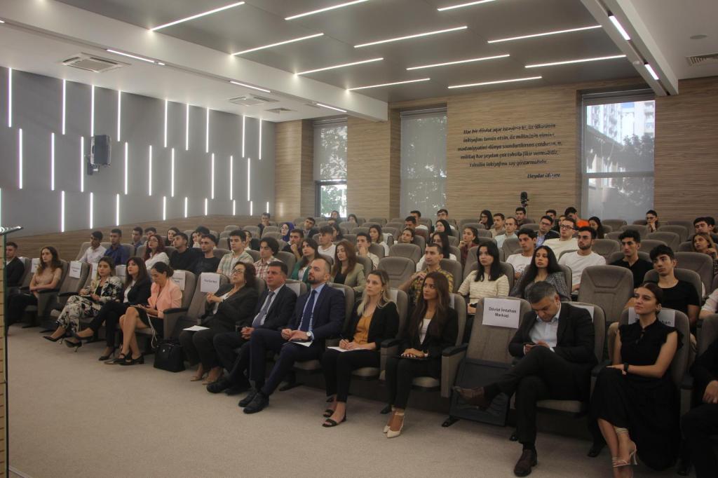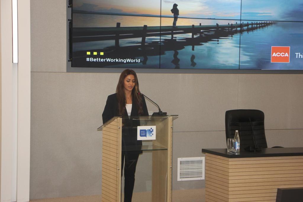 Daha sonra “Ernst & Young Global Limited Azərbaycan” (EY) şirkətinin direktor müavini Samirə Şabanova Azərbaycanda karyera imkanları, audit, mühasibat uçotu və konsaltinq sektorunun trend mövzuları, mühasibat və maliyyə sektorunun karyeraya necə təkan verə biləcəyi və yeni qazanılmış peşəkar və texniki bacarıqların yüksək vəzifələrə apara biləcək yolu haqqında çıxış edib.