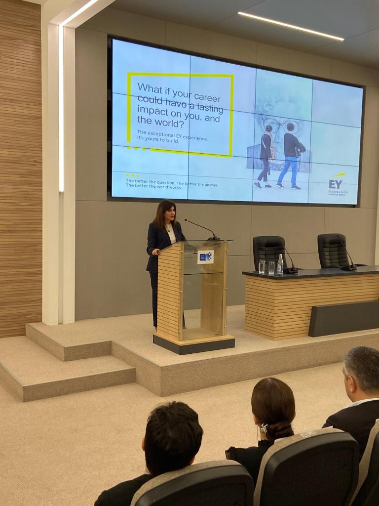 Bundan əlavə, şirkətin İnsan resursları departamentinin mütəxəssisi Fəridə İsrafilbəyova EY Azərbaycanın ACCA ilə birgə “Öyrən, bitir və işlə” layihəsinə start verəcəyini qeyd edib. Layihə haqqında məlumat verən mütəxəssis tədbirin sonunda tələbələrin suallarını cavablandırıb.