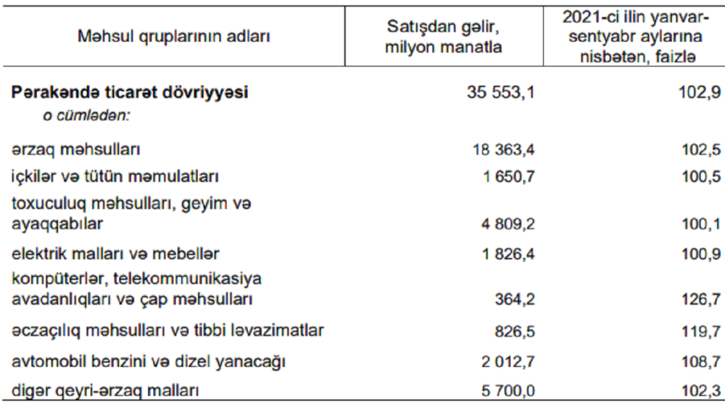 2021-ci ilin yanvarsentyabr ayları ilə müqayisədə pərakəndə ticarət dövriyyəsi real ifadədə 2,9 faiz, o cümlədən ərzaq məhsulları, içkilər və tütün məmulatları üzrə 2,3 faiz, qeyri-ərzaq malları üzrə 3,6 faiz artıb.