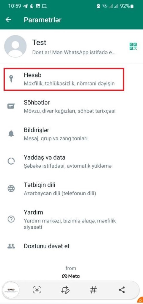- “Parametrlər” səhifəsində “Hesab” xanasını seçin