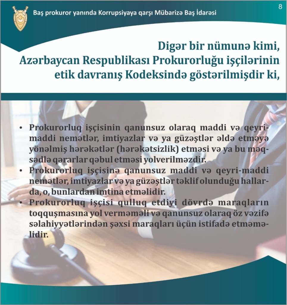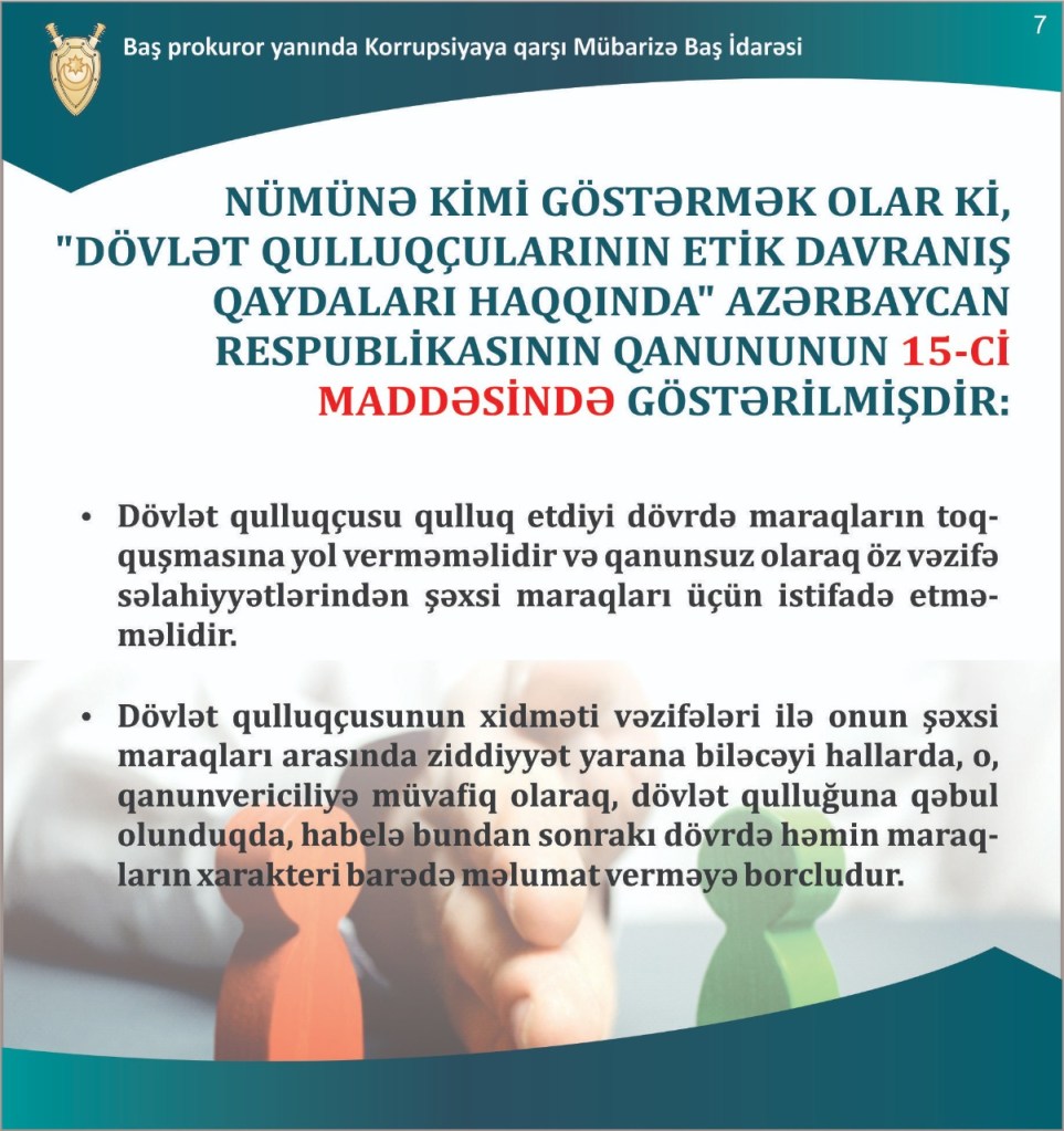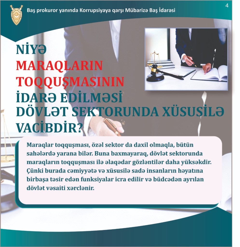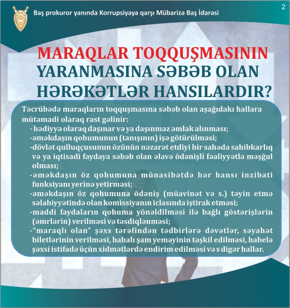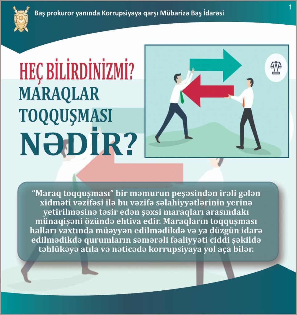 Baş prokuror yanında Korrupsiyaya qarşı Mübarizə Baş İdarəsi tərəfindən hazırlanmış slaydlarda “Maraqlar toqquşması nədir?” mövzusu ilə bağlı vətəndaşlara maraqlı izah verib.