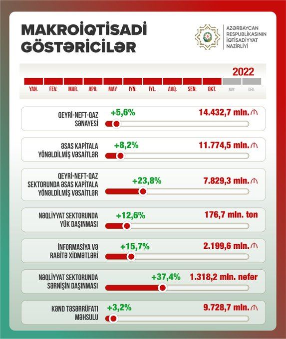2022-ci ilin yanvar-oktyabr aylarının nəticələrinə görə, bir çox makro iqtisadi göstəricilərdə artım müşahidə olunur.