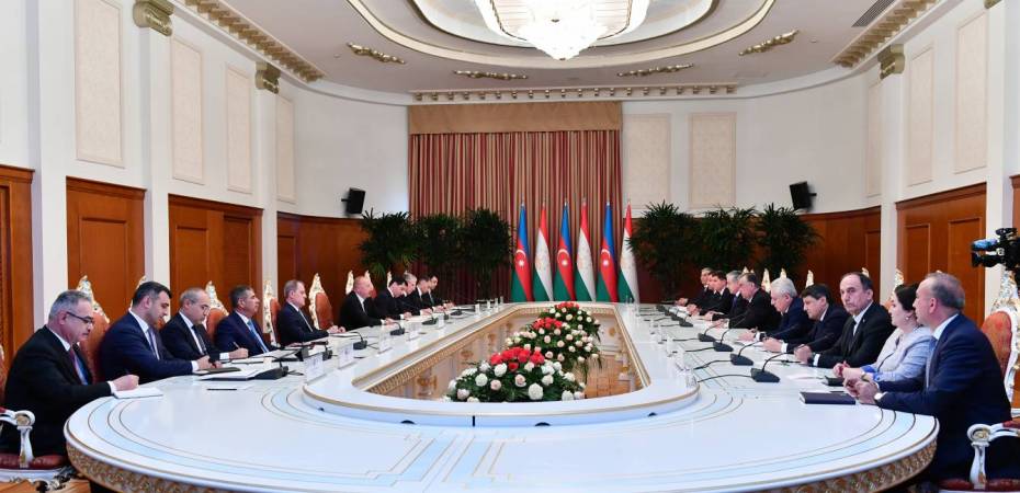 Daha sonra Prezident İlham Əliyevin Tacikistan Respublikasının Prezidenti Emoməli Rəhmon ilə geniş tərkibdə görüşü olub.