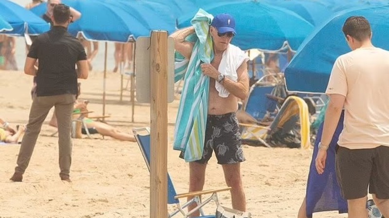 Video görüntüdə Amerika prezidentinin ictimai çimərlikdə bir neçə cangüdənlə müşaiyyət olunduğu nəzərə çarpır.