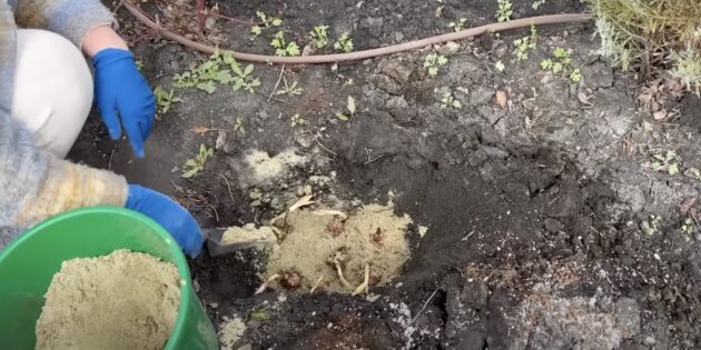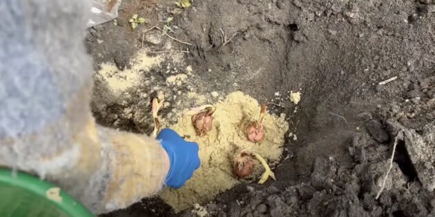 Присыпьте луковицы песком так, чтобы он закрывал их примерно наполовину.