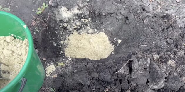 На дно посадочной ямы насыпьте примерно 5 см дренажного слоя. Для этого можно использовать смесь песка с мелким щебнем или керамзит.