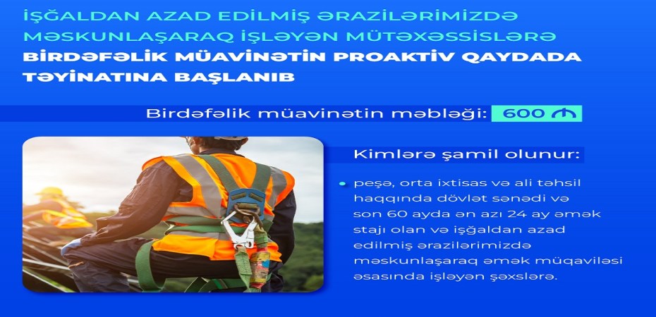 İşğaldan azad edilmiş ərazilərimizdə məskunlaşaraq işləyən mütəxəssislərin ilki maddi-məişət şəraitinin dəstəklənməsi məqsədilə onlara birdəfəlik müavinətin (600 manat) təyin olunmasına başlanıb.