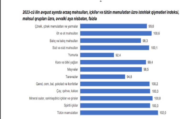 2023-cü ilin avqust ayında ərzaq məhsulları, içkilər və tütün məmulatları üzrə istehlak qiymətləri indeksi əvvəlki aya nisbətən 99,1%, əvvəlki ilin avqust ayına nisbətən 107,4% təşkil edib.