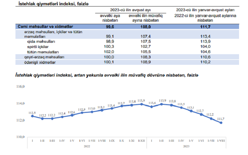 2023-cü ilin yanvar-avqust aylarında istehlak qiymətləri indeksi 2022-ci ilin yanvar-avqust aylarına nisbətən 111,7% təşkil edib.