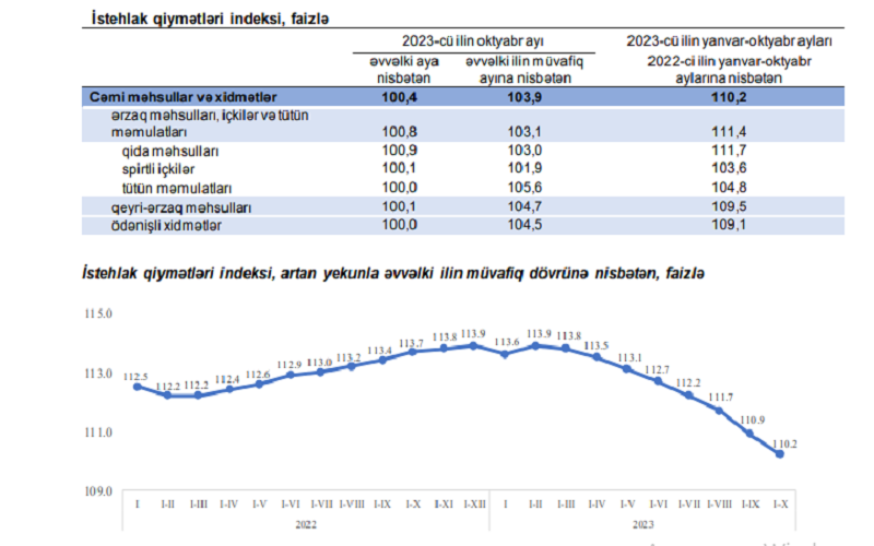 İstehlak bazarında qiymətlərin dəyişməsi haqqında 2023-cü ilin yanvar-oktyabr aylarında istehlak qiymətləri indeksi 2022-ci ilin yanvar-oktyabr aylarına nisbətən 110,2 faiz, o cümlədən ərzaq məhsulları, içkilər və tütün məmulatları üzrə 111,4 faiz, qeyri-ərzaq məhsulları üzrə 109,5 faiz, əhaliyə göstərilmiş ödənişli xidmətlər üzrə 109,1 faiz təşkil edib.