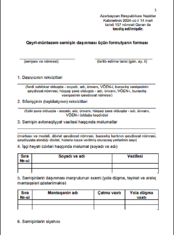 Baş nazir Əli Əsədov imzaladığı qərara əsasən “Qeyri-müntəzəm sərnişin daşınması üçün formulyarın forması” təsdiq edilib.
