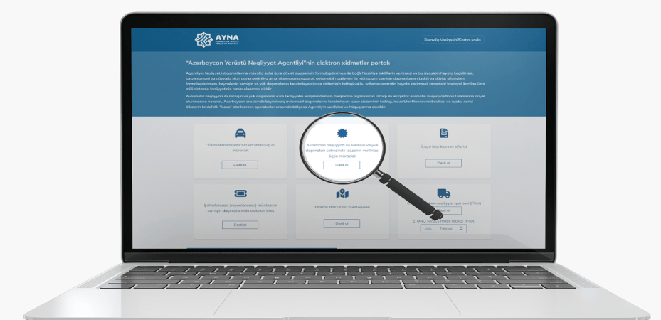 İstifadəçilər https://e-xidmet.ayna.gov.az/ linkinə daxil olaraq, avtomobil nəqliyyatı ilə sərnişin və yükdaşımaları sahəsində icazənin verilməsi üçün müraciət bölməsini seçməlidirlər. Elektron sistem müvafiq dövlət orqanlarının informasiya sistemlərinə inteqrasiya edildiyindən tələb olunan sənədlərin sayı minimuma endirilib, digər dövlət orqanlarının informasiya sistemlərindən əldə edilməsi mümkün olmayan məlumatlarla bağlı sənədlərin skan edilmiş surətinin müraciətə əlavə edilməsi imkanı yaradılıb.