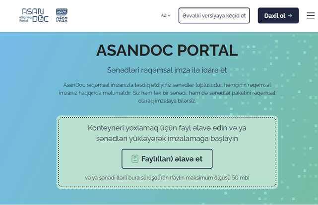 AsanDoc.az, “Asan İmza” gücləndirilmiş mobil elektron imza texnologiyasını istifadə edən elektron imzalama, saxlanma və sənədləri paylaşmaq üçün qabaqcıl bir platformadır. Bu texnologiya, B.EST Solutions Azerbaijan tərəfindən hazırlanmış və İqtisadiyyat Nazirliyinin Dövlət Vergi Xidməti tərəfindən təqdim edilmişdir, elektron hokümətin əsas komponenti və vətəndaşların rəqəmsal şəxsiyyətinin təsdiqi kimi fəaliyyət göstərir.