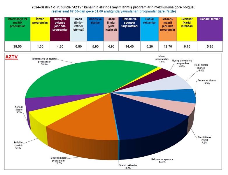 Statistikaya əsasən, ümumi olaraq açıq ümumölkə yerüstü televiziya yayımında ilin ilk üç ayı ərzində efirdə olmuş proqramların 23,5%-ni informasiya və analitik proqramlar təşkil edib.