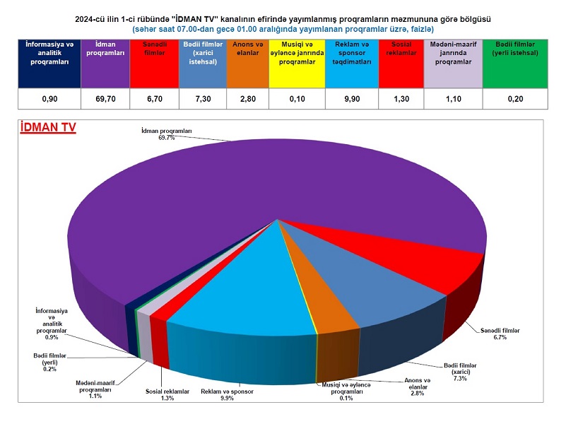 Sıralamada daha sonra idman proqramları (15,2% ilə), musiqili və əyləncəli formatda proqramlar (13,9% ilə) və reklam məzmunlu materiallar (12%) yer tutur. Mədəni-maarif janrlı proqramların (maarifləndirici, publisistik, tarixi-mədəni və sairə materiallar) payı bütün kanallar üzrə ümumi olaraq 9,4% olub.