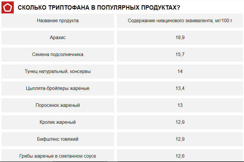Maksimum triptofan balıq kürü, pendir və kəsmik, balıq, quş əti və ətdə olur. Nəzərə alın ki, triptofanın mənbəyi əzələ toxumasıdır və birləşdirici toxumalarda (kollagen, elastin, jelatin) praktiki olaraq heç bir triptofan yoxdur.