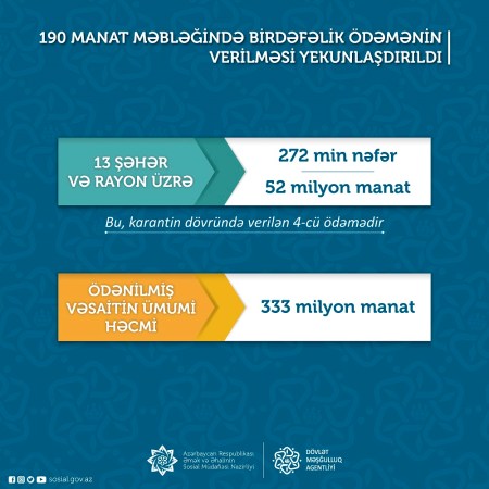 Avqust ayında əhaliyə 52 milyon manat həcmində birdəfəlik ödəniş verilib